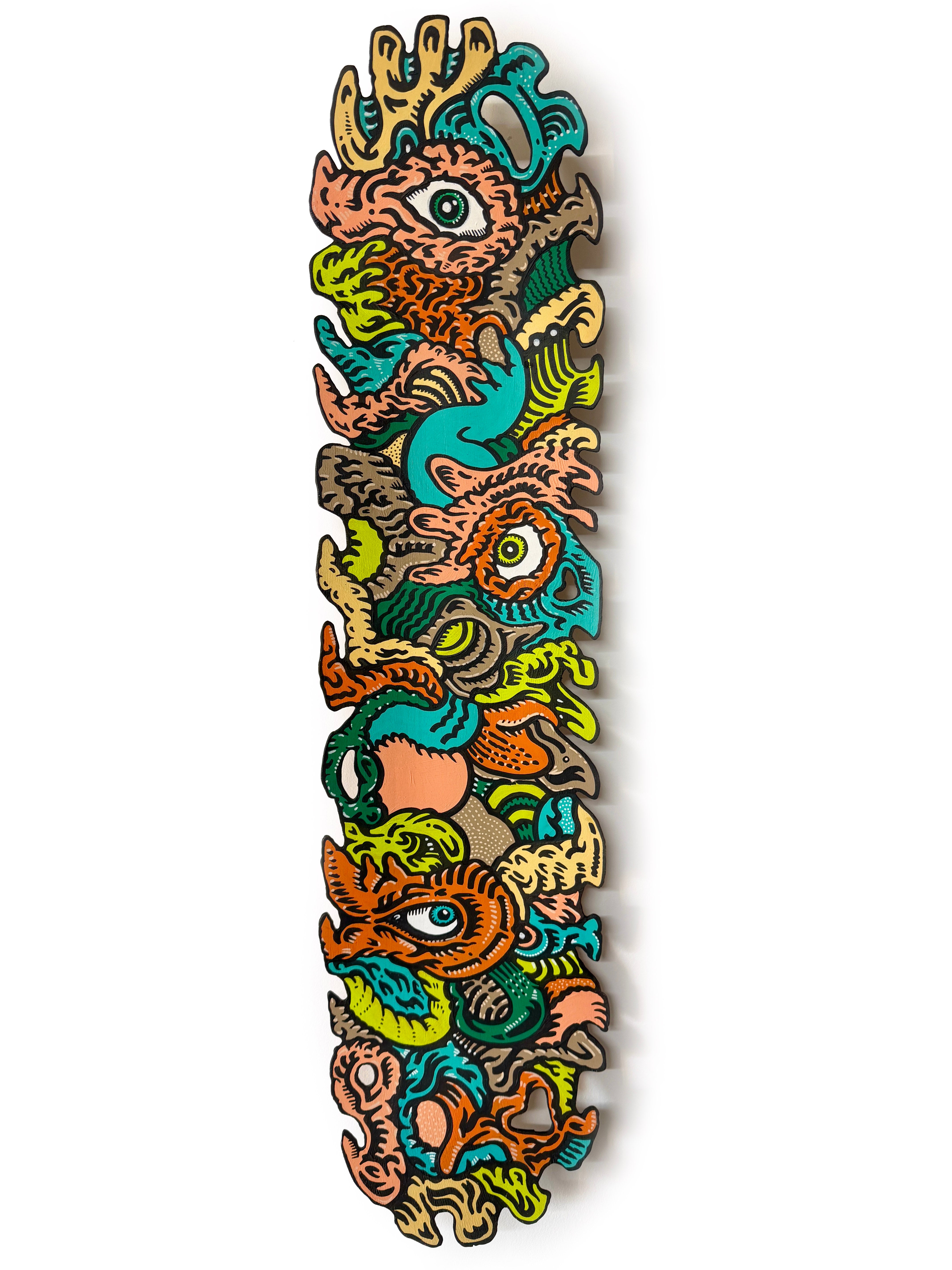 Il s’agit d’un travail artistique réalisé sur un véritable skateboard, mêlant différentes matières et techniques.