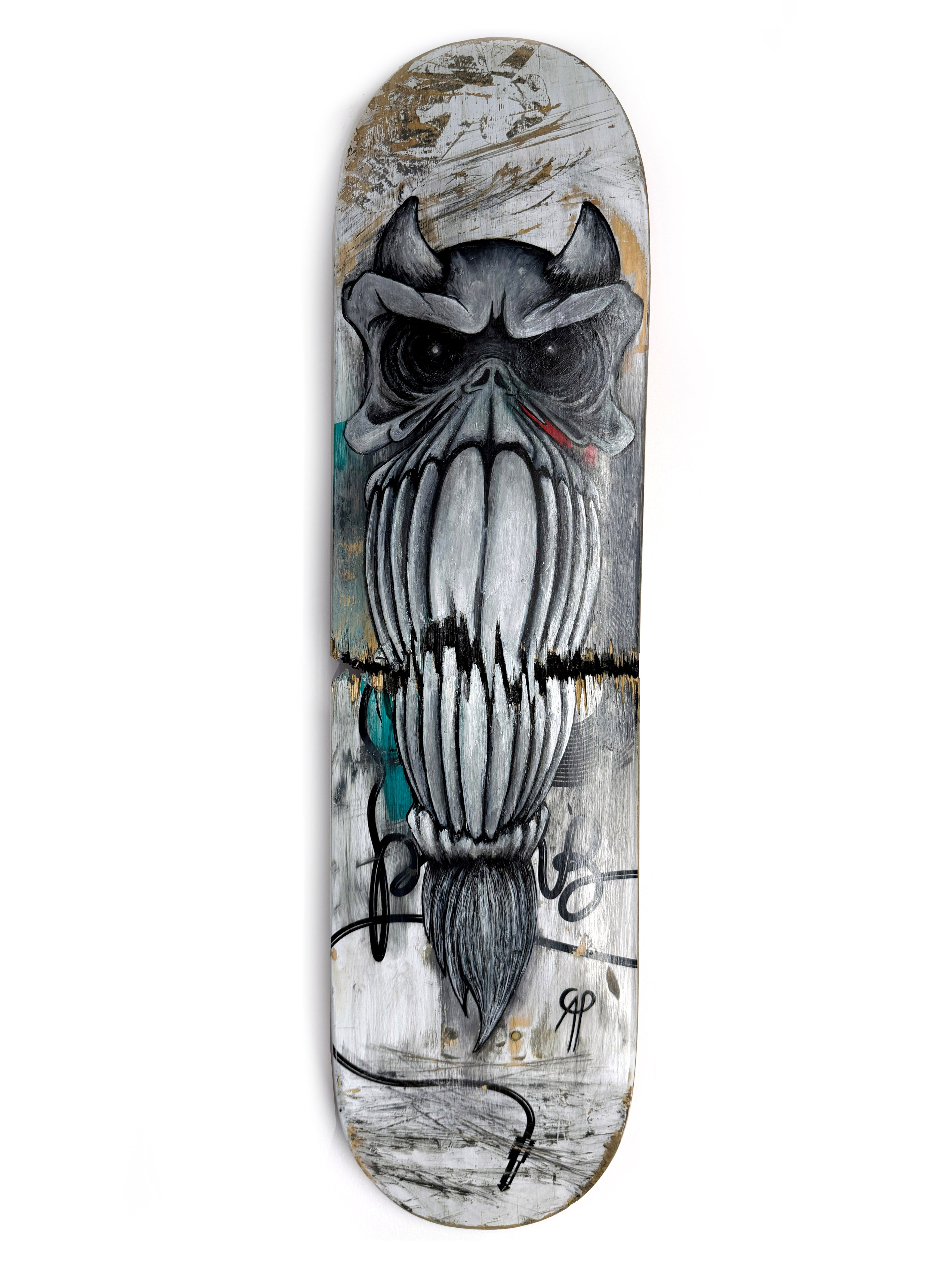 Il s’agit d’un travail artistique réalisé sur un véritable skateboard, mêlant différentes matières et techniques.