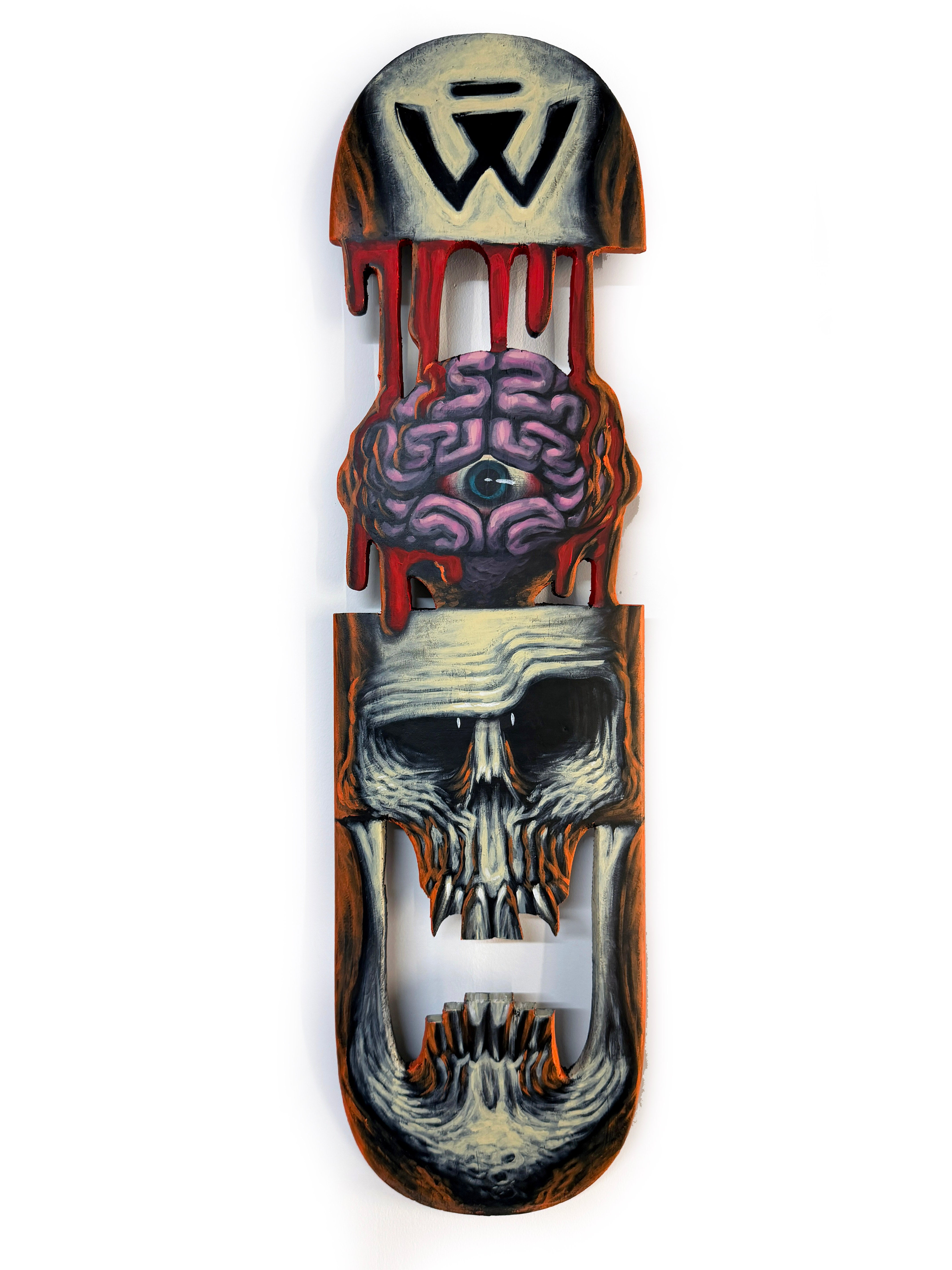 Il s’agit d’un travail artistique réalisé sur un véritable skateboard, mêlant différentes matières et techniques.