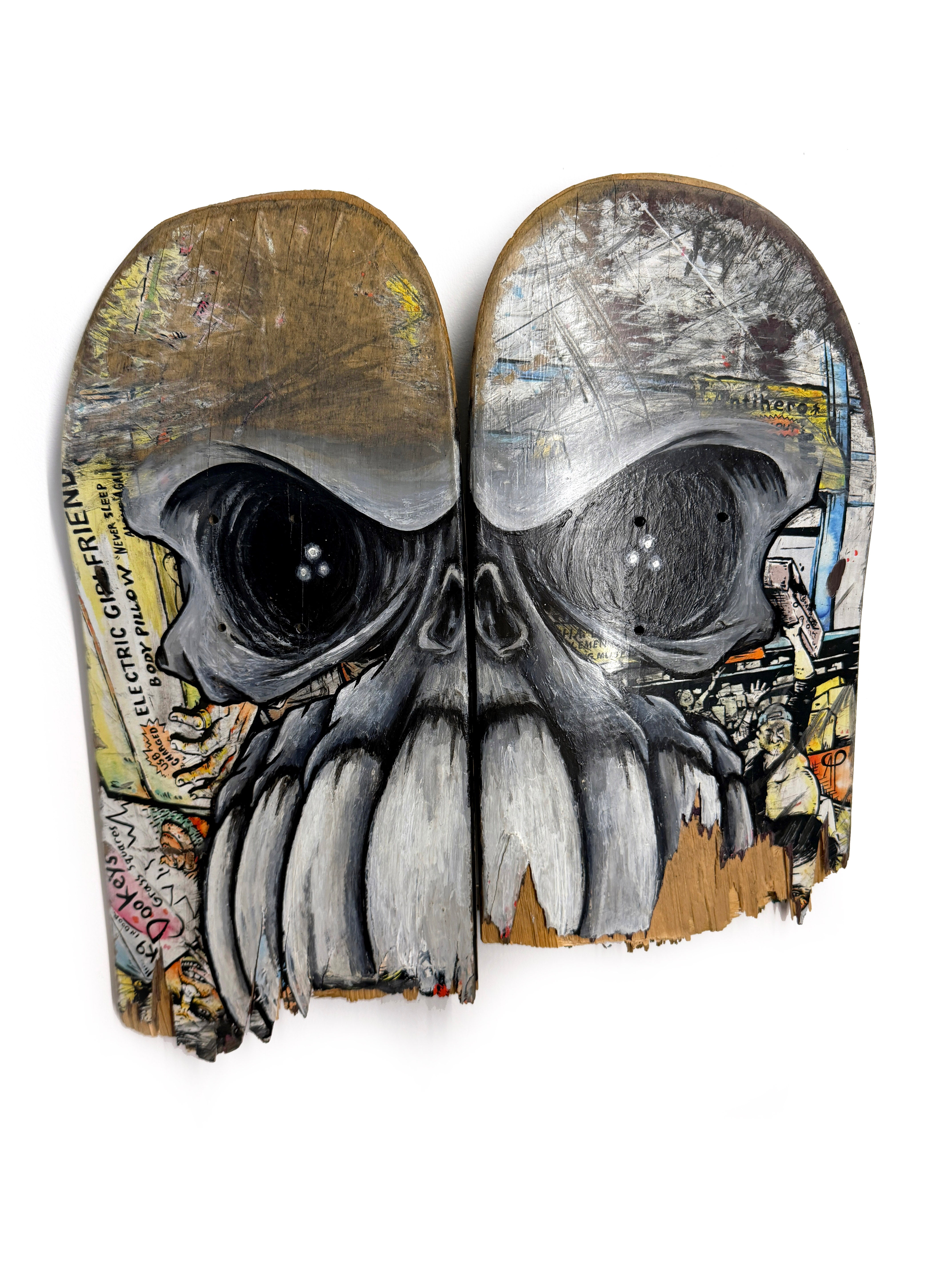 Il s’agit d’un travail artistique réalisé sur un véritable skateboard, mêlant différentes matières et techniques.