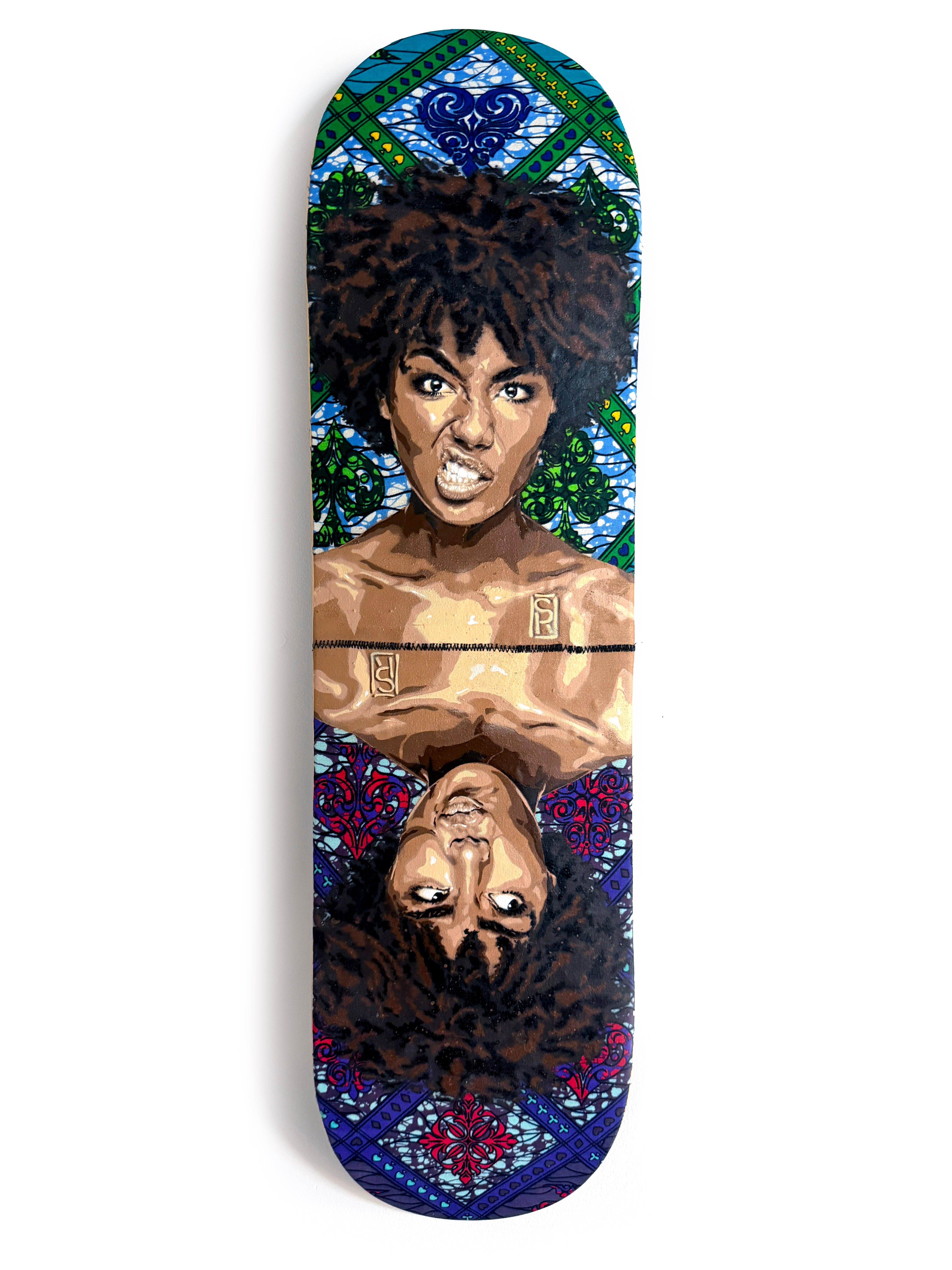 Il s’agit d’un travail artistique réalisé sur un véritable skateboard, mêlant différentes matières et techniques.