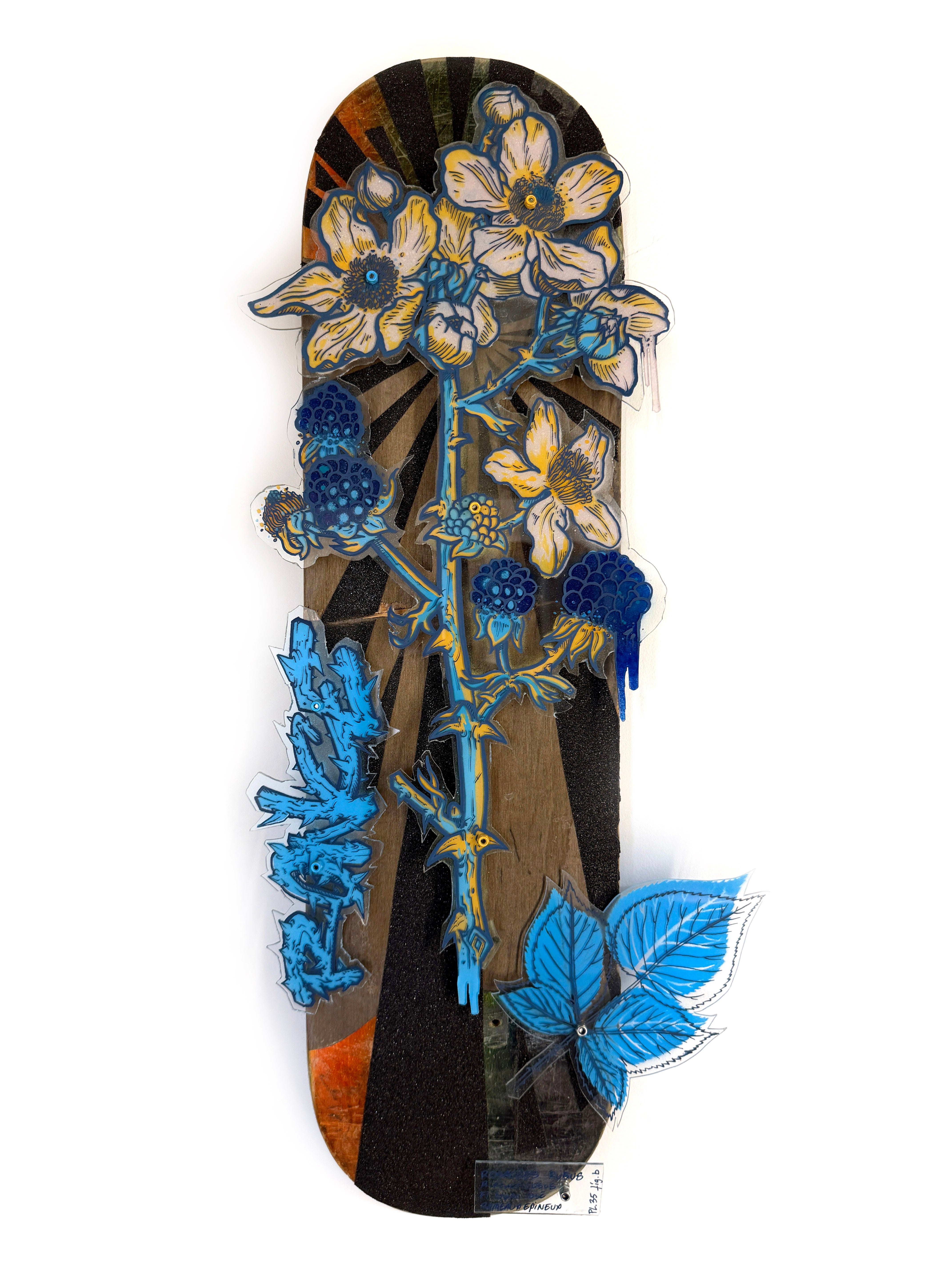 Il s’agit d’un travail artistique réalisé sur un véritable skateboard, mêlant différentes matières et techniques.