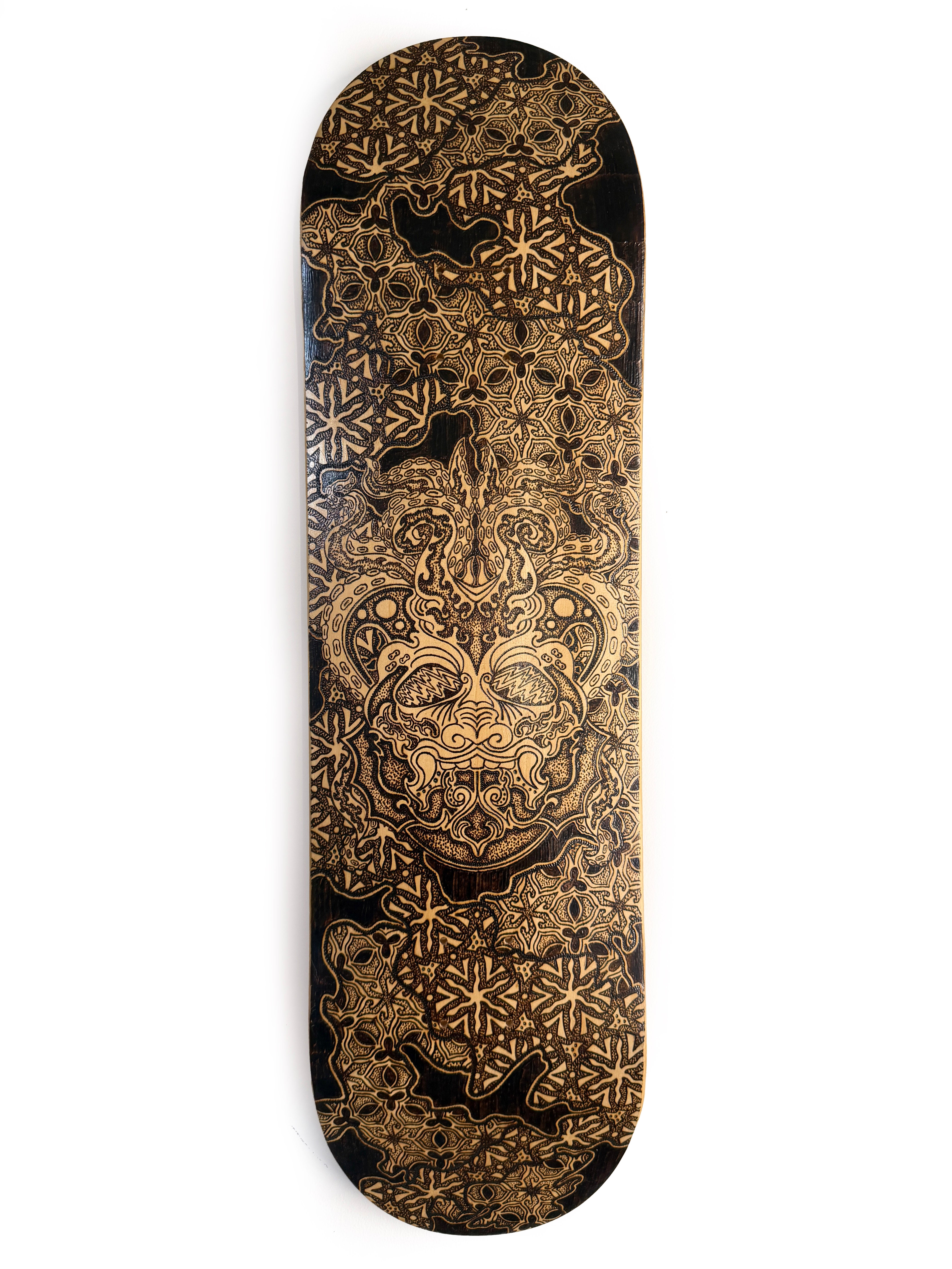 Il s’agit d’un travail artistique réalisé sur un véritable skateboard, mêlant différentes matières et techniques.