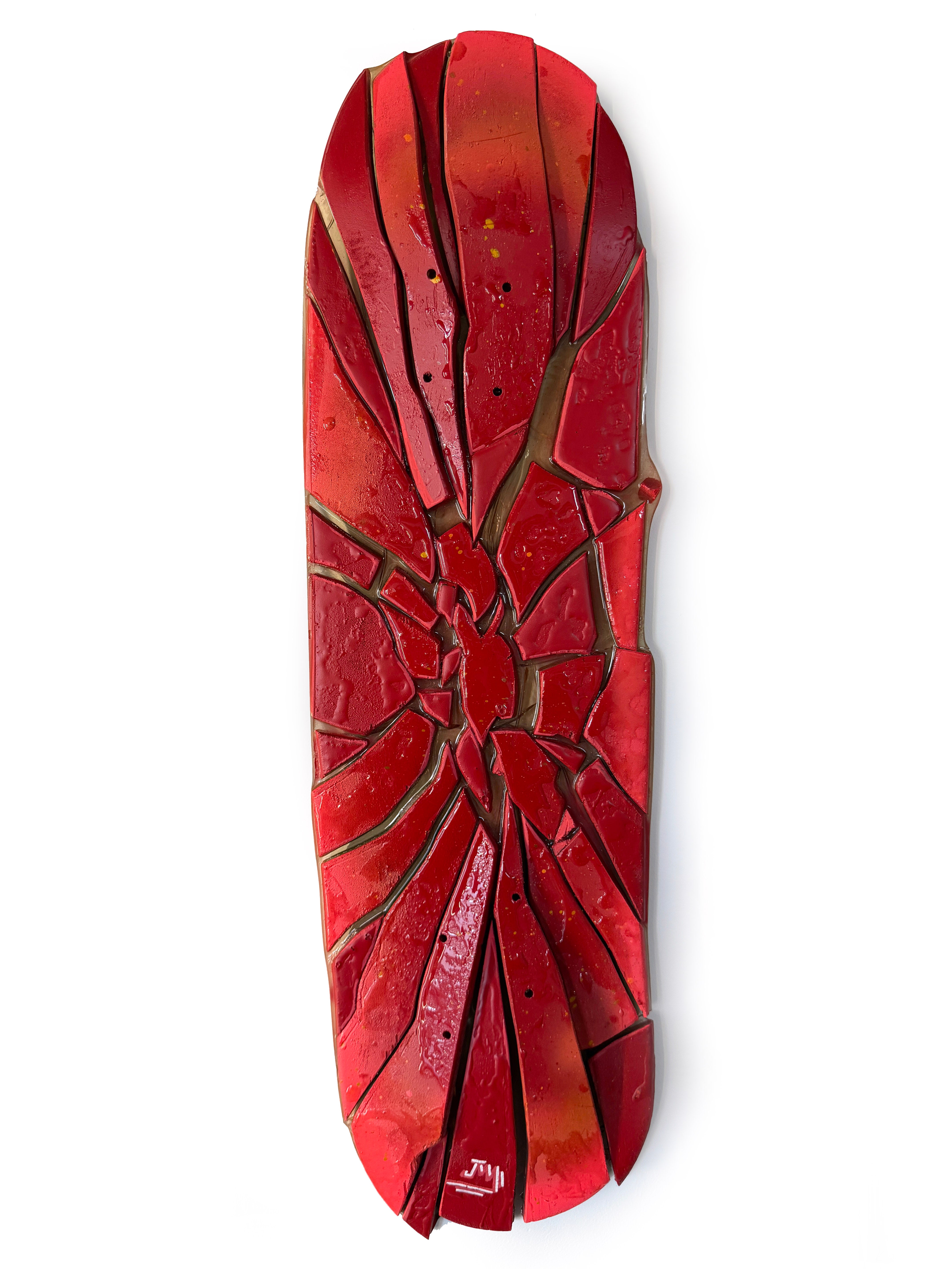 Il s’agit d’un travail artistique réalisé sur un véritable skateboard, mêlant différentes matières et techniques.